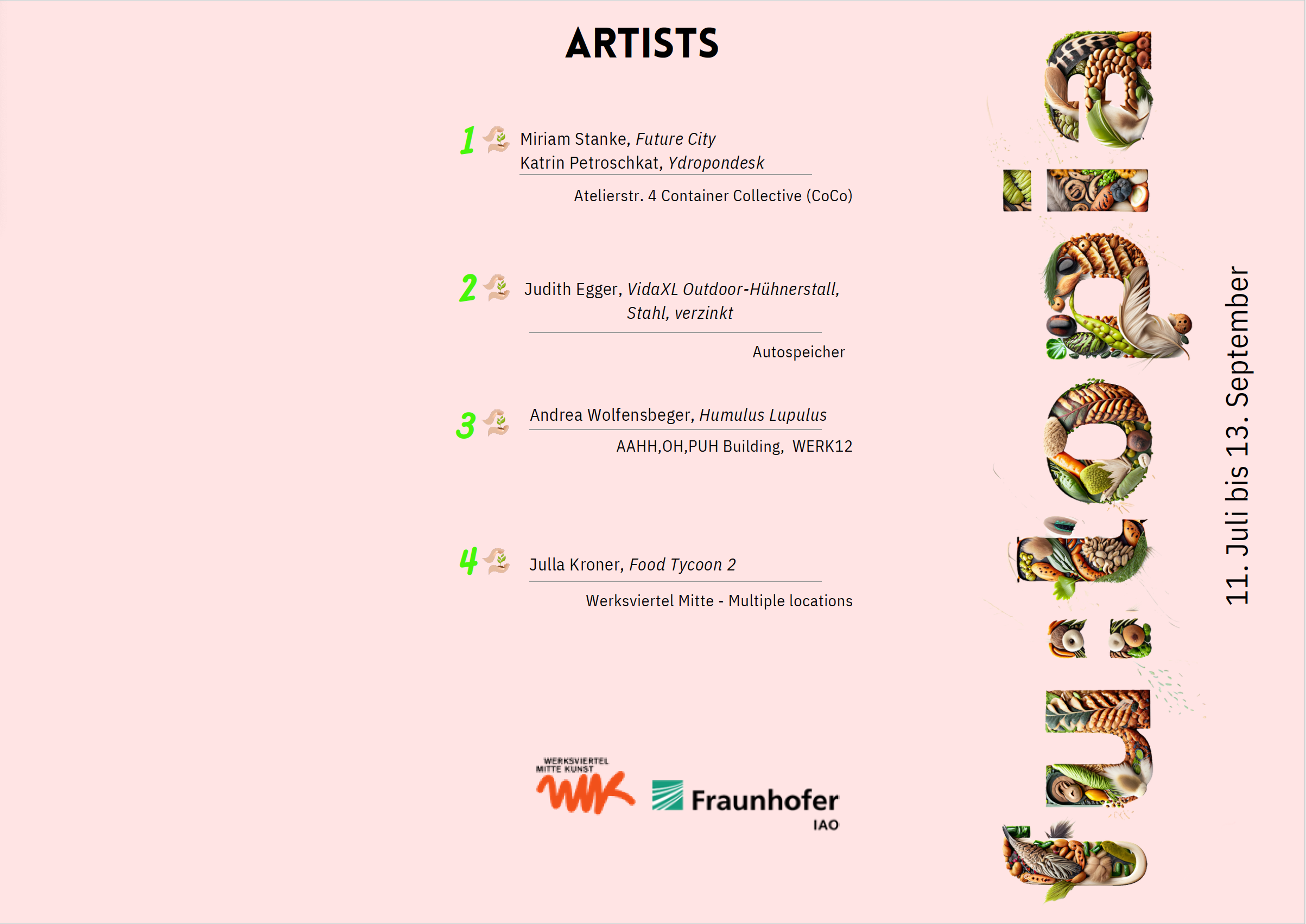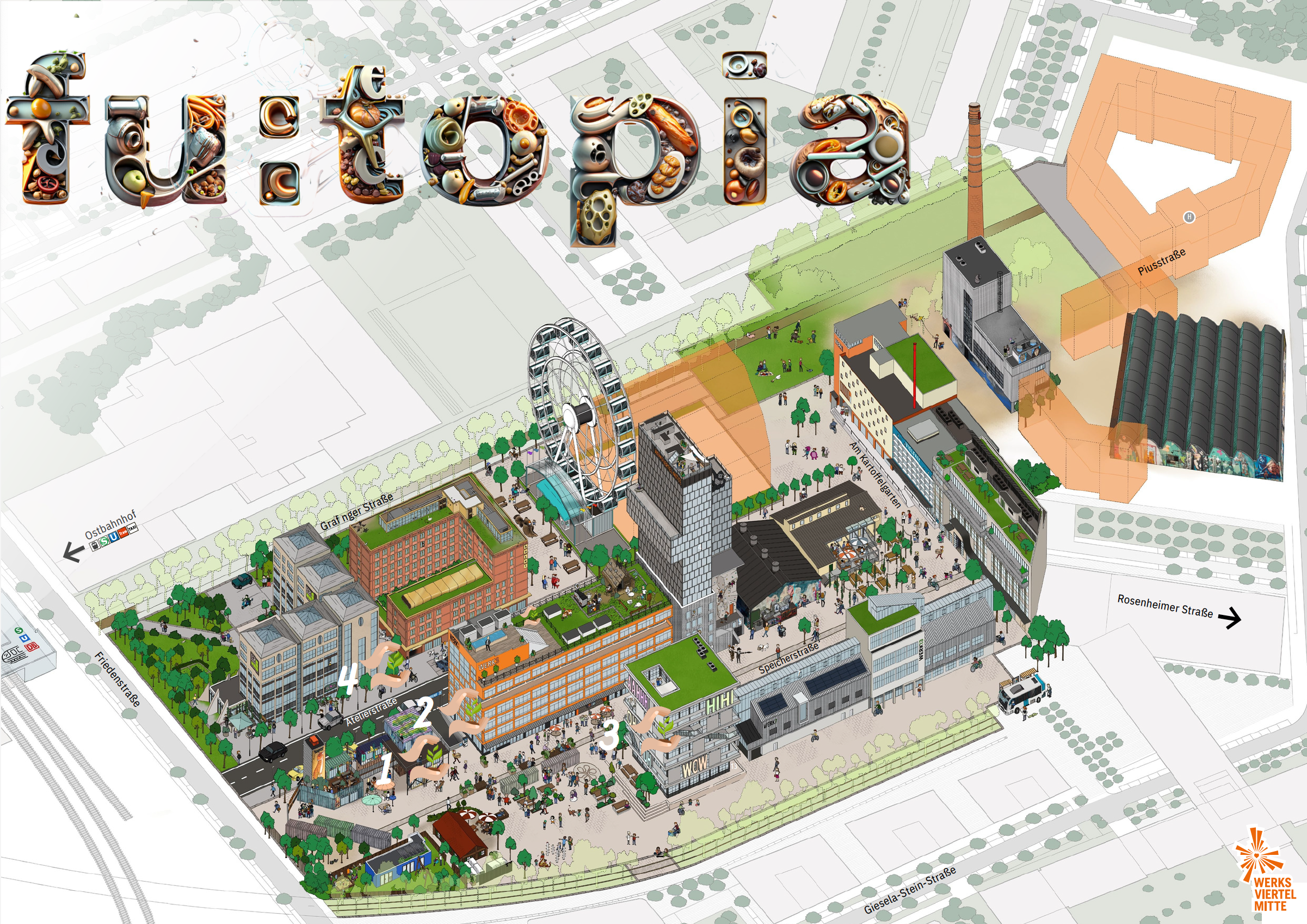Die immersive Ausstellung „fu:topia“ findet vom 11. Juli bis 29. Oktober 2023 verteilt über das gesamte Werksviertel-Mitte in München statt. Die Ausstellung ist Teil des interdisziplinären Projekts „Immersive Urban Food Landscapes“. In diesem Rahmen kooperieren Wissenschaftler:innen des Fraunhofer IAO und sieben Künstler:innen, um Szenarien für die urbane Lebensmittelproduktion der Zukunft zu entwickeln. Die Ausstellung zeigt die Ergebnisse dieser Zusammenarbeit. Die Wissenschaftler:innen entwickelten Realszenarien, basierend auf lokal erhobenen Daten und aktuellen wissenschaftlichen Entwicklungen im Feld der technologieorientierten Lebensmittelproduktion. Dem gegenüber stehen im Rahmen der Ausstellung die künstlerischen Umsetzungen und Auseinandersetzungen mit dem Thema. Hierfür wurden verschiedenste Darstellungsformen gewählt. Entworfen wurden Werke an der Grenze zu Bildender Kunst, Immersion, Intervention und Performance.